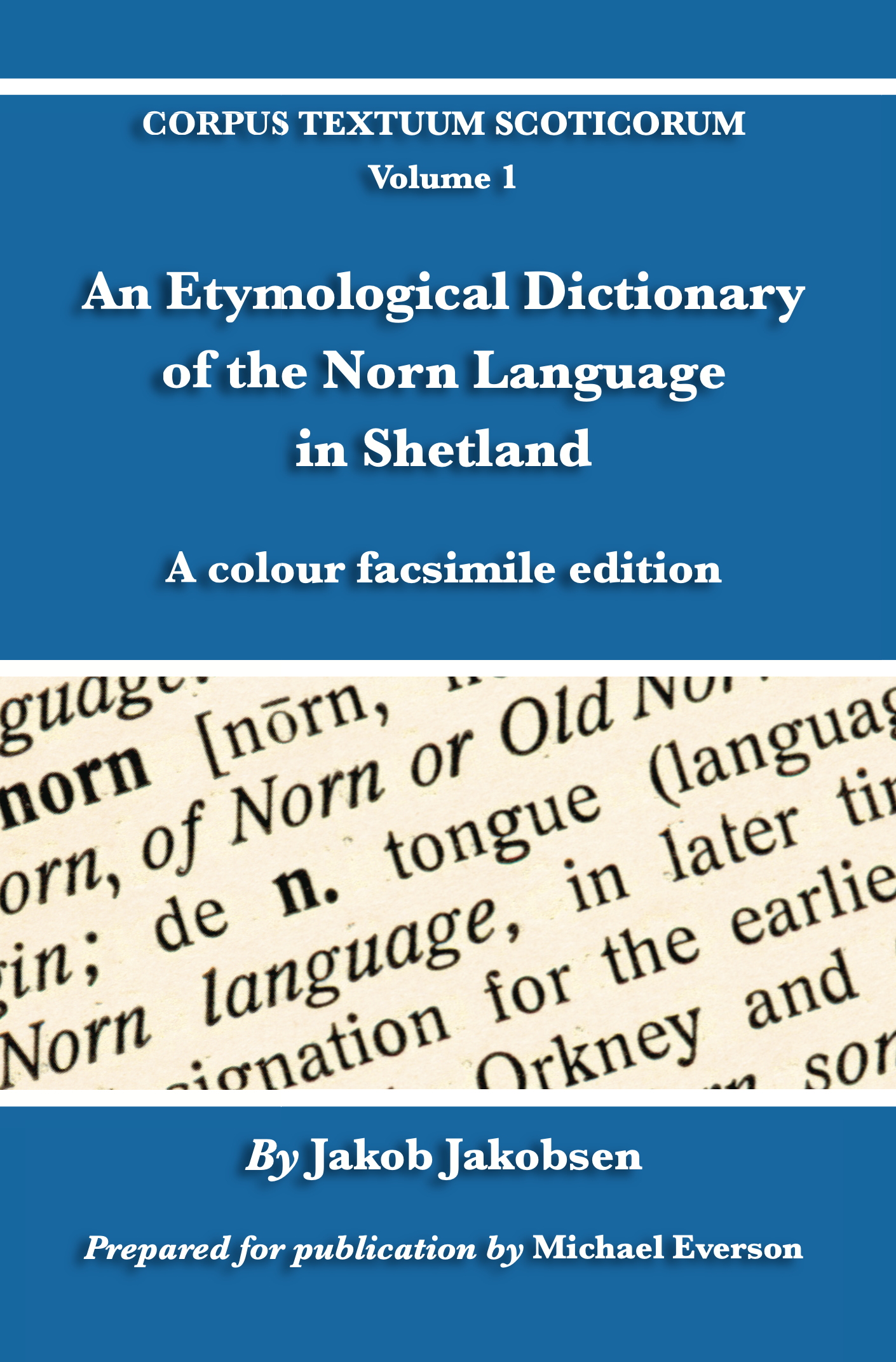 Jakob Jakobsen’s dictionary was first published in Danish in 1908 as Etymologisk Ordbog over det norrøne Sprog paa Shetland. Its English translation was published in two volumes, in 1928 and 1932 by David Nutt in London and Vilhelm Prior in Copenhagen, and in 1985 it was reprinted in Lerwick by the Shetland Folk Society. Both editions of the book are very scarce and those rare copies that are available from antiquarian booksellers tend to vary both in condition and in cost. This colour facsimile edition contains the entire text in a single volume. A table of contents has been added to the front matter with added section numbers to help the reader navigate Jakobsen’s introductory material; the section numbers have been added in the margin of the text itself. There were 40 corrections given on an errata sheet in volume I, and 21 corrections given in volume II; all of the corrections have been implemented on the scanned images and so the errata sheets have not been reproduced. Corpus Textuum Scoticorum is a series presenting editions of language and literature of particular interest to Scotland. The series focuses on but is not limited to volumes dealing with the Scots and Scottish Gaelic languages.